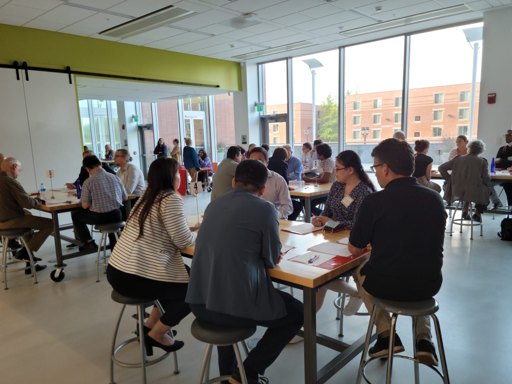 People seated at tables in a bright, modern room with large windows, engaged in conversation during a professional networking event.